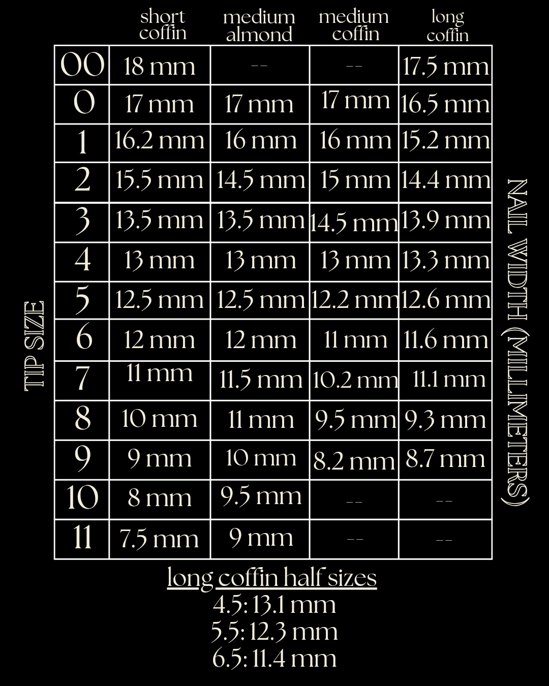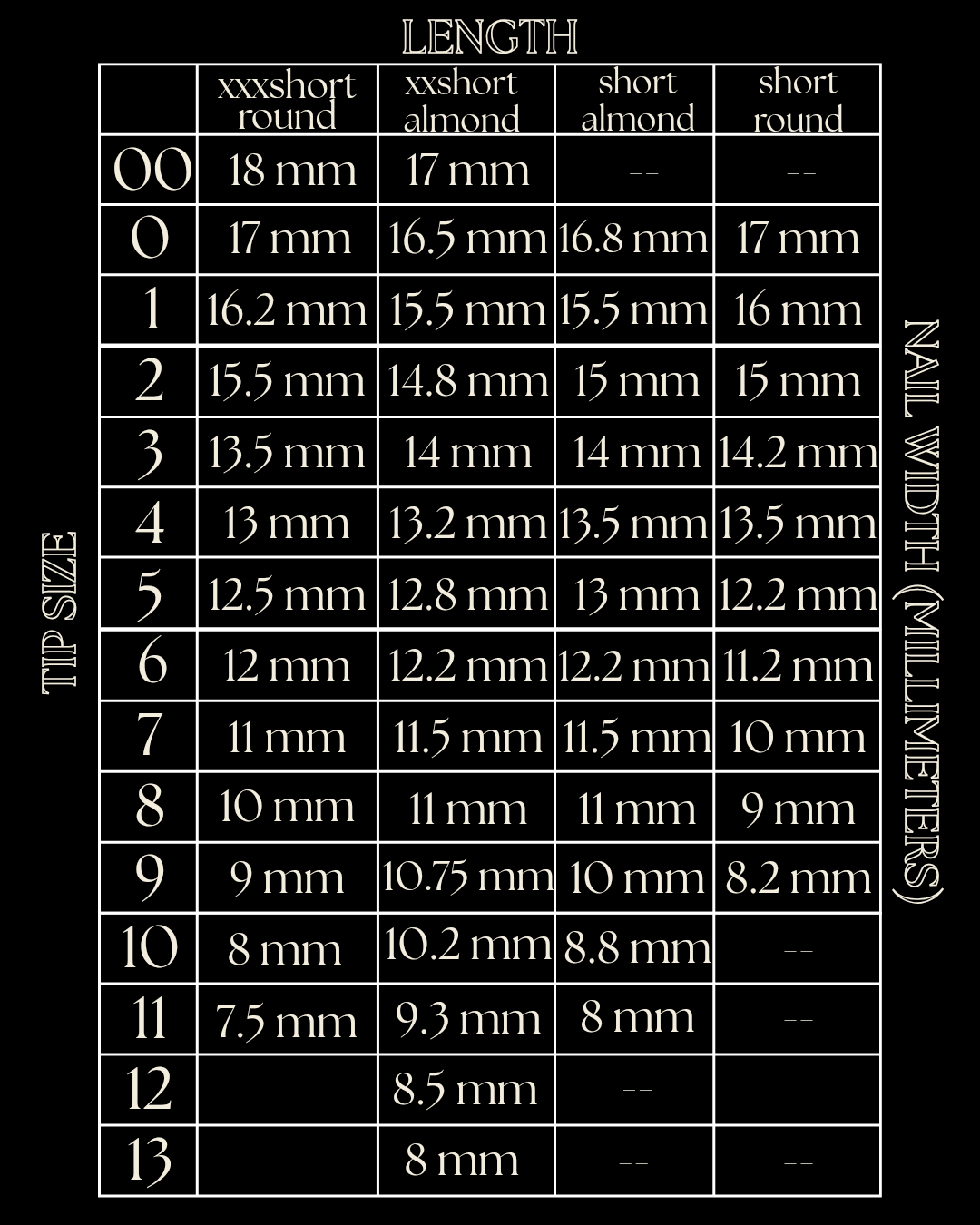 Using a soft measuring tape over the natural nail, measure (in millimeters) the widest part of your nail bed from side to side. Use the sizing chart below to match the width to the corresponding tip size.