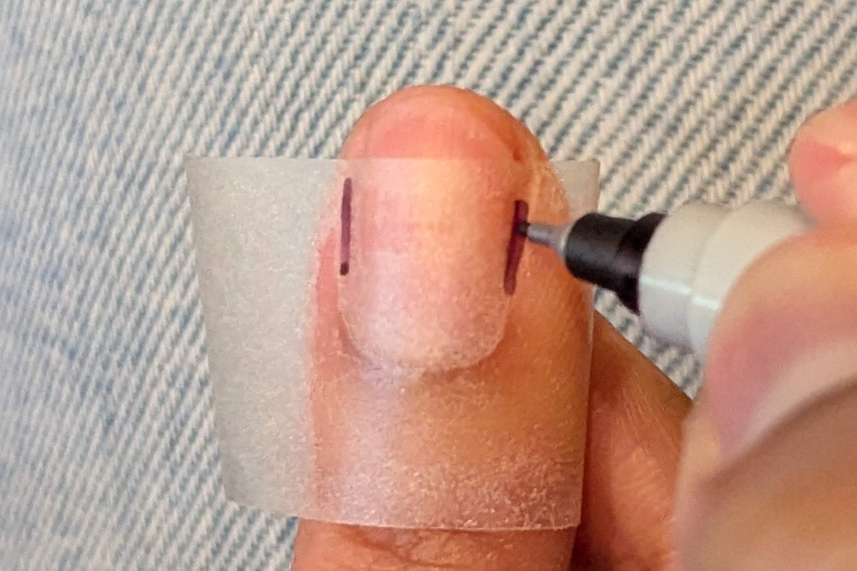 Applying the tape over your nail bed, mark the edges of your nail bed where it meets the side wall using a marker or pen on both sides. Remove the tape and measure (in millimeters) over a ruler